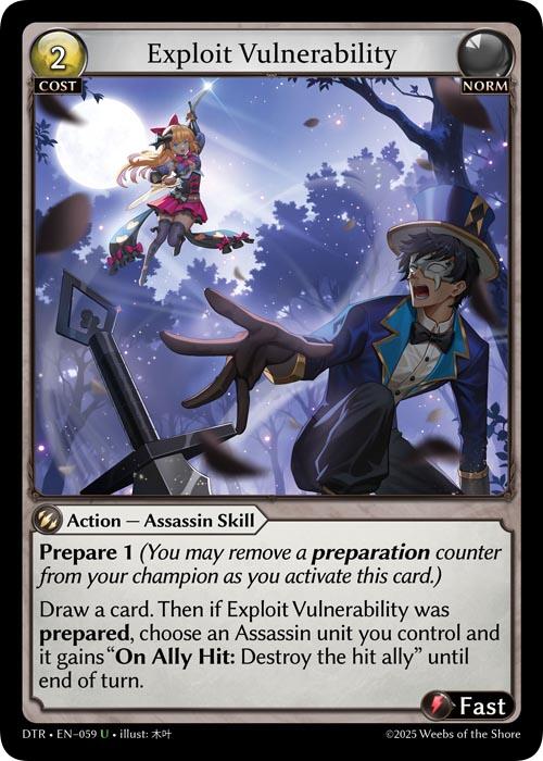 Draw a card. Then if Exploit Vulnerability was prepared, choose an Assassin unit you control and it gains On Ally Hit: Destroy the hit ally" until end of turn."