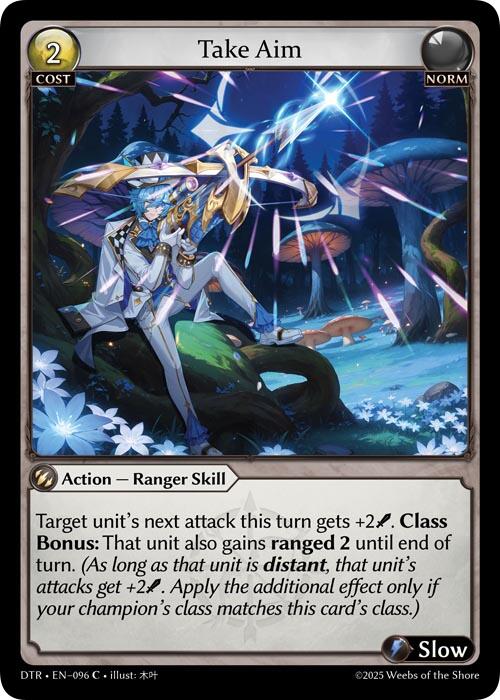 Target unit's next attack this turn gets +2 power. Class Bonus: That unit also gains ranged 2 until end of turn. (As long as that unit is distant, that unit's attacks get +2 power. Apply the additional effect only if your champion's class matches this card's class.)