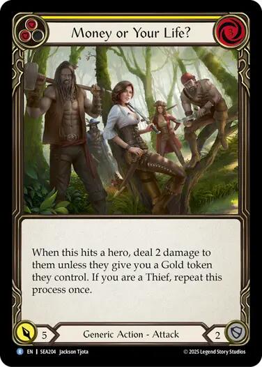 When this hits a hero, deal 2 damage to them unless they give you a Gold token they control. If you are a Thief, repeat this process once.